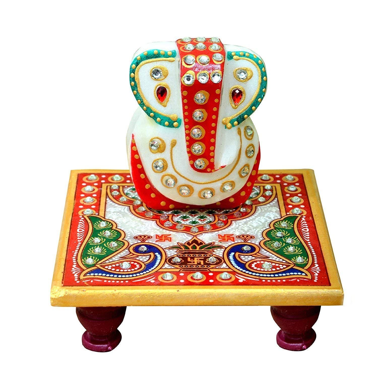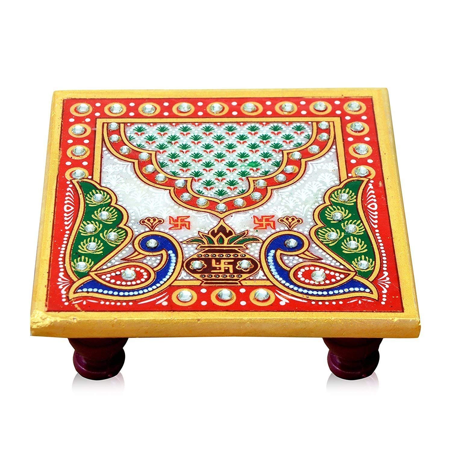 - The Marble Chowki is painted and has a peacock design painted on it and has semi-precious stones pasted all over it.